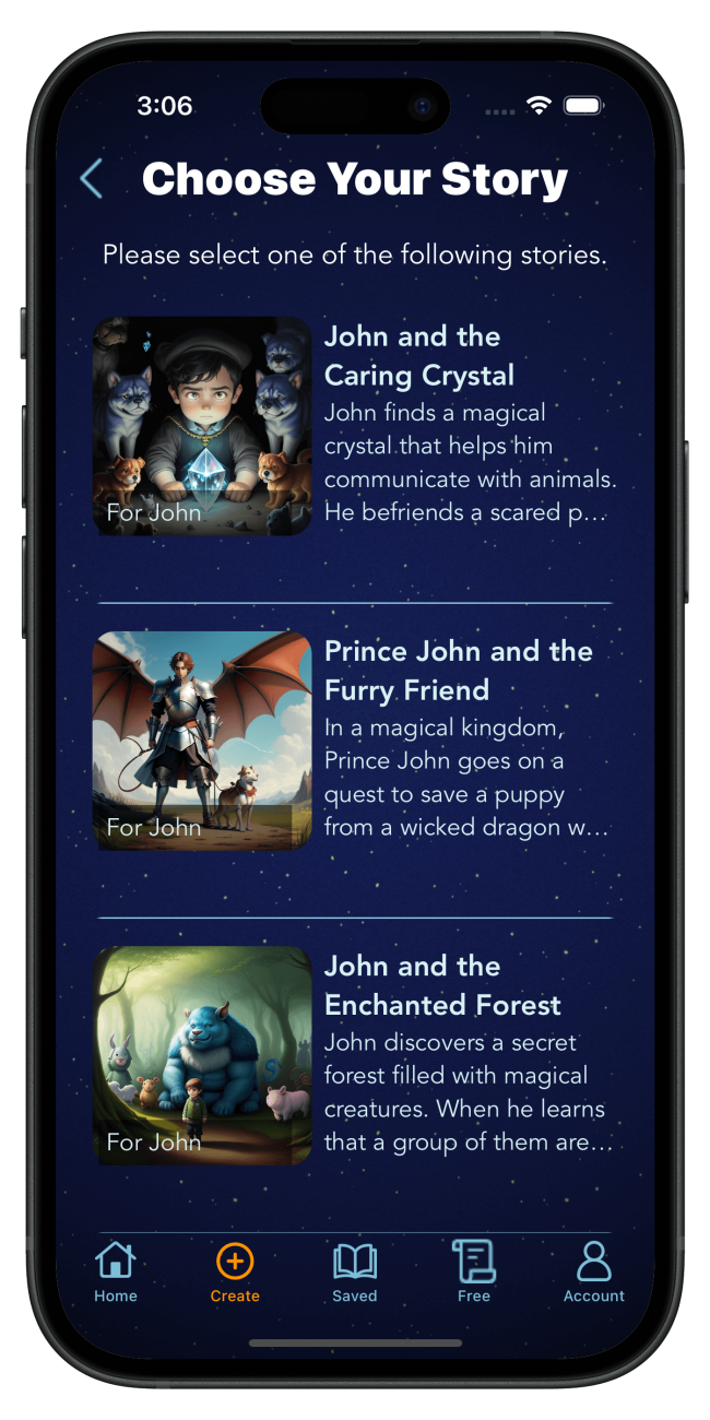 After selecting a bedtime story topic, our app presents you with a ‘3 Choices Screen,’ offering a curated selection of three delightful stories within that theme. This feature simplifies the decision-making process, ensuring that you can quickly and easily choose the perfect tale to enchant your little one.