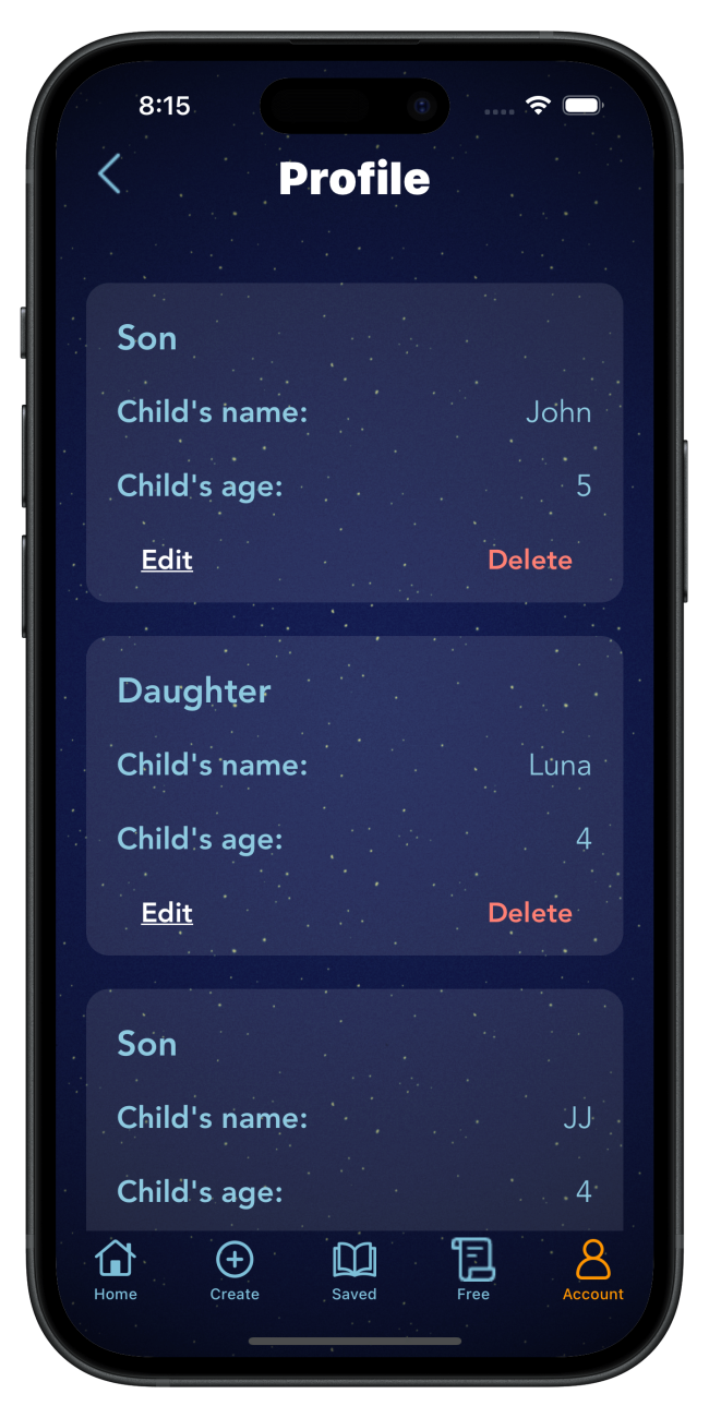 The ‘Add a Child Field Page’ is a thoughtful and personalized feature of our app designed to enhance your storytelling experience. This page allows you to create a unique profile for each child, tailoring the app’s content to their individual preferences, age, and interests. By adding details such as your child’s name, age, and favorite themes or characters, the app can recommend stories that are most engaging and suitable for them. This customization ensures that the stories resonate more with your child, making bedtime reading a more immersive and enjoyable experience. The ‘Add a Child Field Page’ is easy to navigate and ensures that each child’s bedtime story journey is as unique and special as they are, creating a more intimate and engaging storytelling atmosphere.