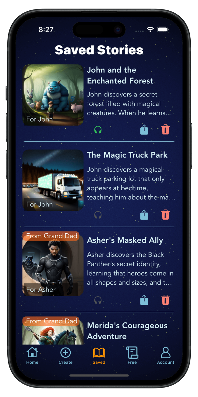 With this feature, creating a personalized library of cherished bedtime stories is effortless, ensuring a comforting and familiar storytelling experience night after night.In addition, the ‘Past Saved Stories Screen’ includes features such as sorting and filtering, which make it easier for you to navigate through your collection and find the right story for any occasion.